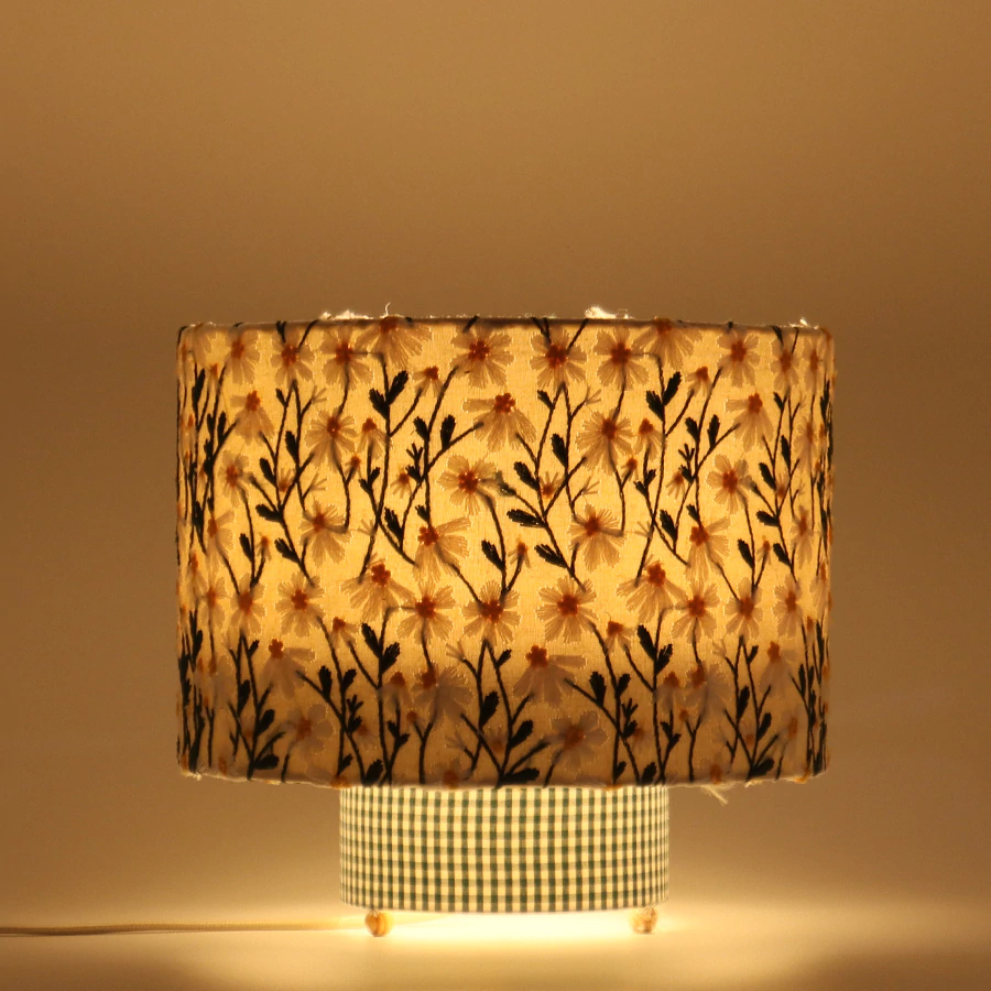 Aqueça sonhos com os sonhos do seu pequeno com o Abajur Leve Nano. Cada detalhe, do bordado de margaridas à base xadrez, traz aconchego e poesia. 🌼.