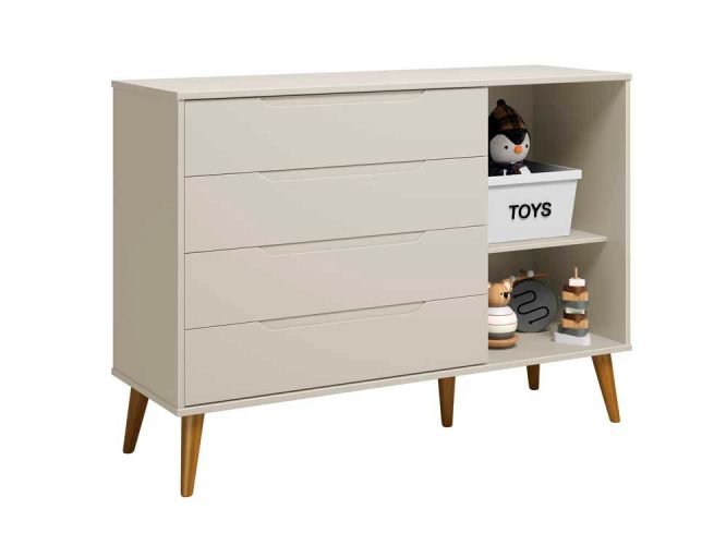 A Cômoda Sapateira Elfe Retro 1P4G na cor areia fosco é a escolha perfeita para organizar o espaço do seu pequeno com estilo e segurança. Fabricada em 100% MDF, possui puxadores embutidos e corrediças telescópicas que garantem um uso prático e duradouro. Com um design acolhedor e sistema anti tombamento, proporciona tranquilidade para os pais e conforto para as crianças. Os pés podem ser personalizados em madeira tradicional ou natural, permitindo harmonizar com a decoração do ambiente.