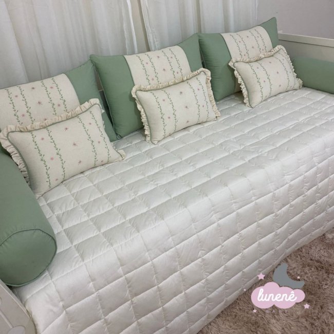 Produto composto por: 01 Edredom para Bicama – 2, 10 m x 1, 40 m 03 Encostos para Bicama – 64 cm x 44 cm 02 Rolos para Bicama – 58 cm x 16 cm (diam.) 03 Almofadas – 38 cm x 28 cm; Composição: Tecido: Liso: 100% Algodão 200 Fios Enchimento: 100% Poliéster: Tecidos: 100% Algodão 200 Fios. Gênero: Menino. Cor: Linho Verde Malva. Lançamento: Menino. Tema: Clássico. Quantidade de peças: 09 peças.