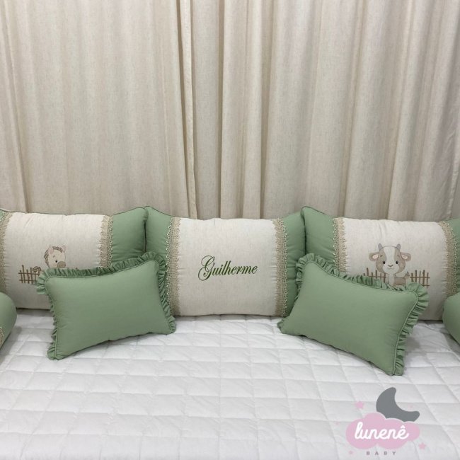 Produto composto por: 01 Edredom Bege – 2, 10 m x 1, 40 m 03 Encostos para Bicama Personalizado – 64 cm x 44 cm 02 Rolos para Bicama Personalizado – 58 cm x 16 cm (diam.) 02 Almofadas Malva – 38 cm x 28 cm 01 Almofada Bordada Ovelha – 38 cm x 28 cm; Composição: Tecido: Liso: 100% Algodão 200 Fios Enchimento: 100% Poliéster: Tecidos: 100% Algodão 200 Fios. Gênero: Menino. Cor: Verde Malva. Lançamento: Menino. Tema: Animais. Quantidade de peças: 09 peças.