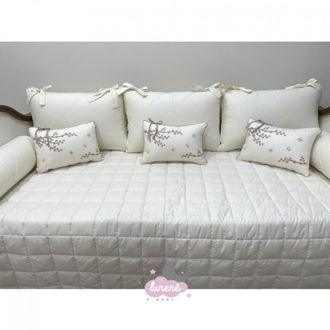 Produto composto por: 01 Edredom para Bicama – 2, 10 m x 1, 40 m 03 Encostos para Bicama – 64 cm x 44 cm 02 Rolos para Bicama – 58 cm x 16 cm (diam.) 03 Almofadas Bordadas de Flor de Cerejeira – 38 cm x 28 cm; Composição: Tecido: Liso: 100% Algodão 200 Fios Enchimento: 100% Poliéster: Tecidos: 100% Algodão 200 Fios. Gênero: Menina. Cor: Bege. Quantidade de peças: 09 peças.
