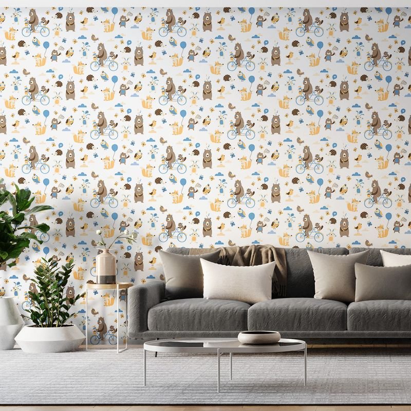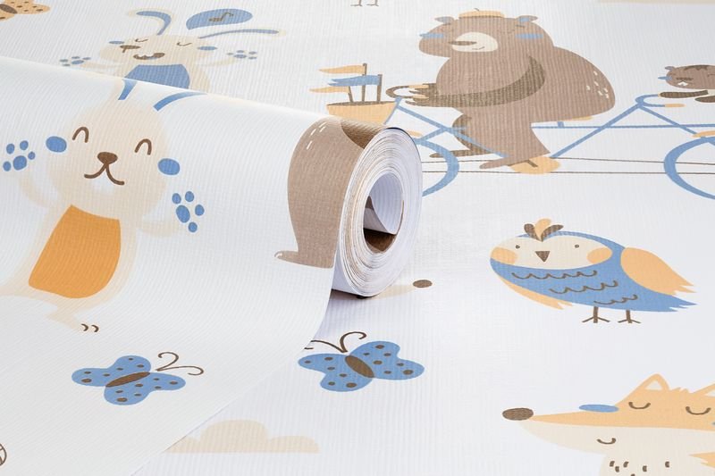 Papel de Parede Vinilizado Personagens Azul e Bege 52cm x 9,5m