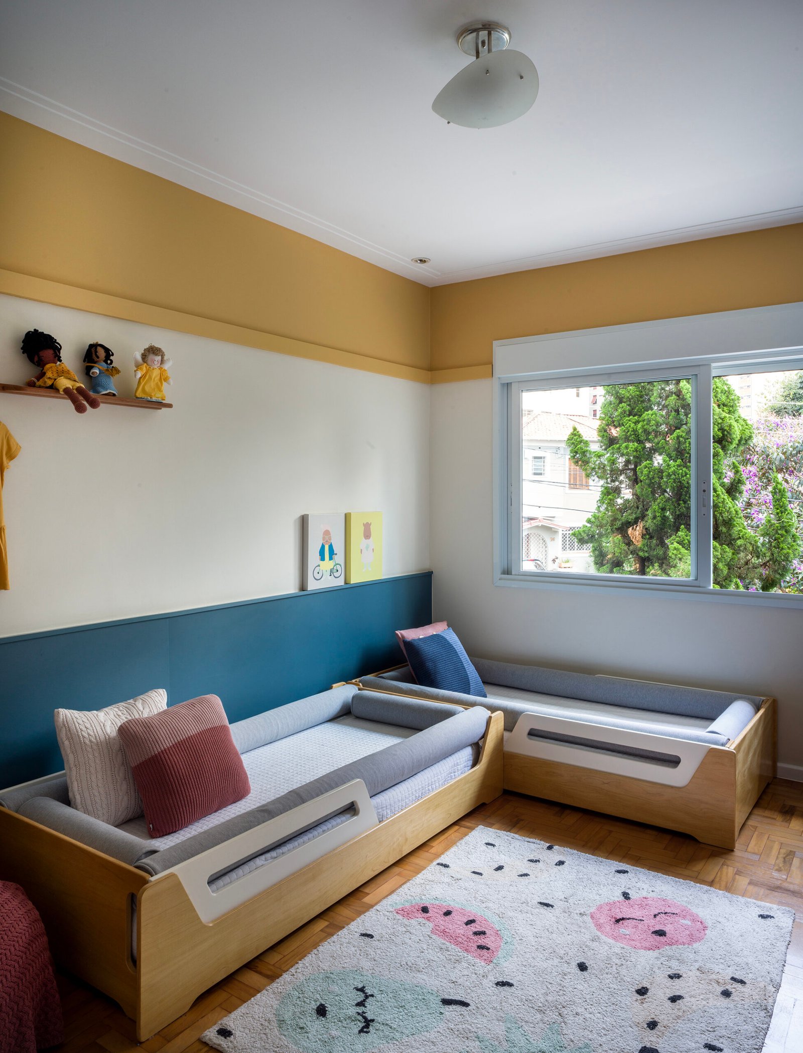 Criamos um refúgio especial para as irmãs, com camas em L que liberaram mais espaço para elas brincarem juntas. A poltrona, onde Elis adora sentar com seu brinquedo favorito, a porquinha de pelúcia, foi pensada para momentos de leitura e descanso. A faixa amarela e a pintura suave trouxeram ainda mais vida ao ambiente, refletindo a energia e o amor dessas pequenas.